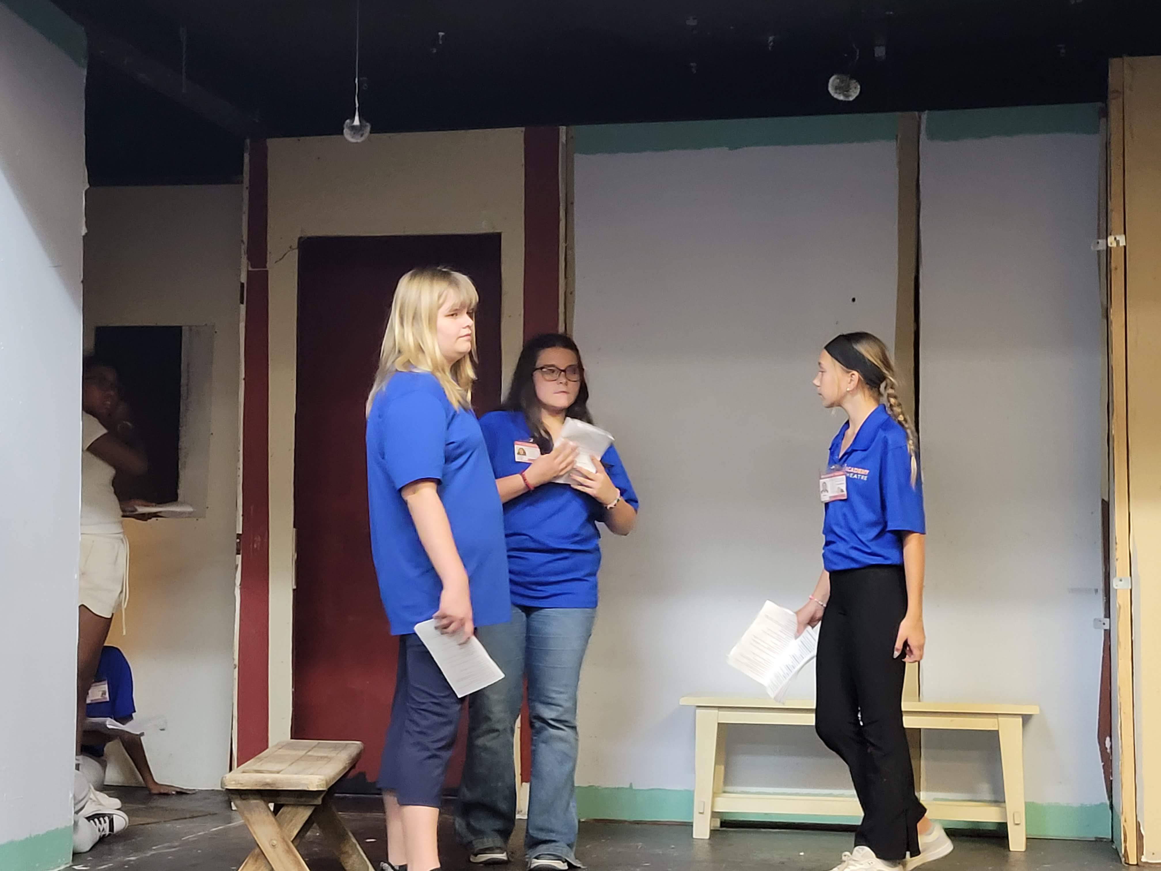 Pictured, left to right: Aubrey Cahill, Sophia Ruiz, and Phinley Lester listen for guidance during rehearsal.